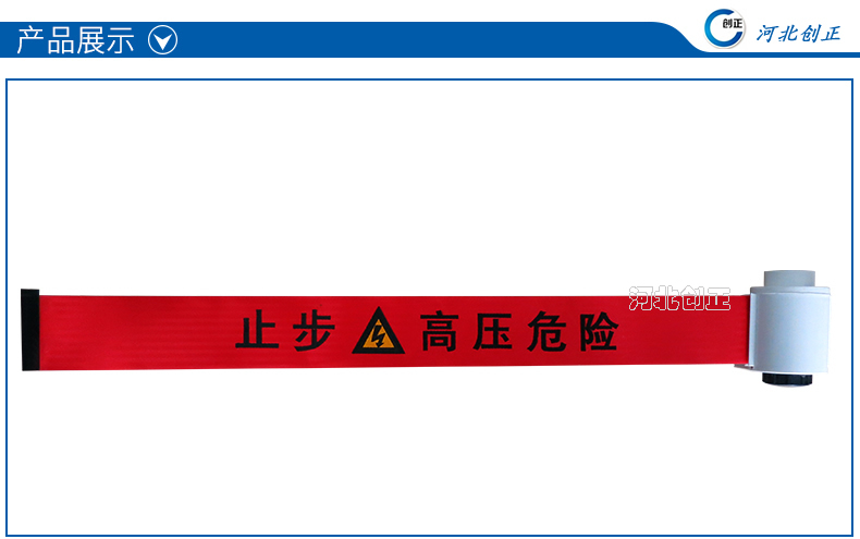 警示帶盒是ABS材料制成;帶是錦綸材質(zhì),上面印有“閃電符號(hào),止步,高壓危險(xiǎn)”等字樣。