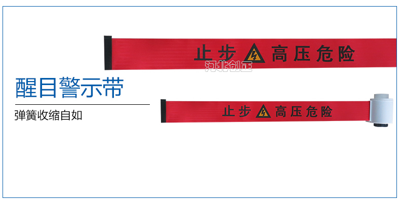 警示帶盒是ABS材料制成;帶是錦綸材質(zhì),上面印有“閃電符號(hào),止步,高壓危險(xiǎn)”等字樣。