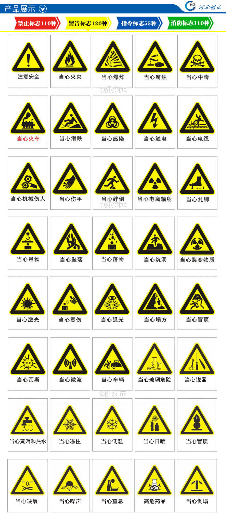2、產(chǎn)品內(nèi)容:禁止、指令、提示、線(xiàn)路相位、消防、通信、交通等。